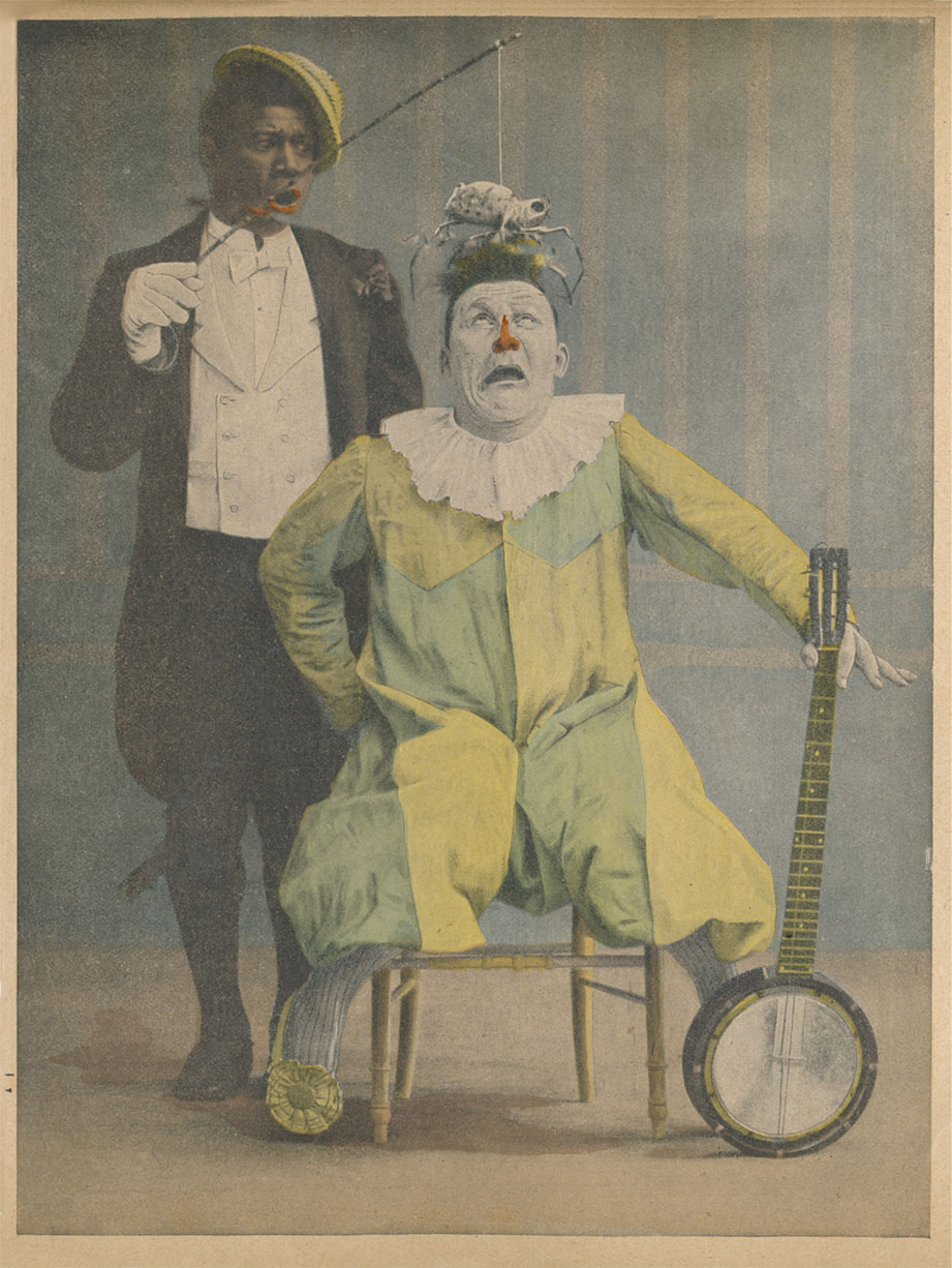 Photo du clown Chocolat habillé d’un veston, d’un manteau et d’un chapeau jaune. Faisant une face comique, il se tient debout et fait bouger une fausse araignée au-dessus de la tête de Footit qui a l’air apeuré. Footit est assis, habillé d’un costume de clown jaune, et tient un banjo.