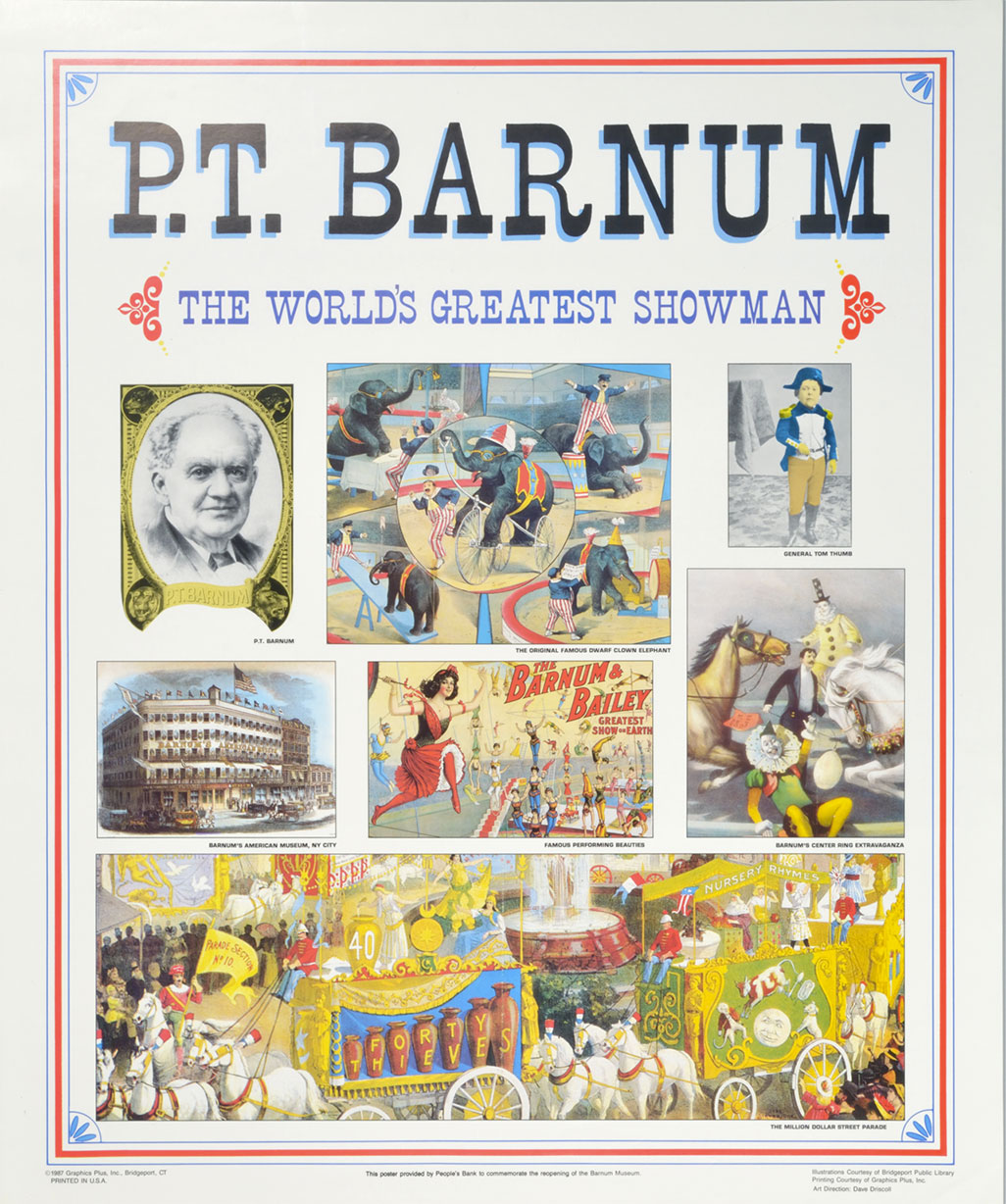 Affiche montrant une photo de P.T. Barnum, le « plus grand showman du monde », une photo d’un homme très petit et des images d’un éléphant, de chevaux et d’artistes de cirque faisant des acrobaties, ainsi qu’une image du musée de Barnum.