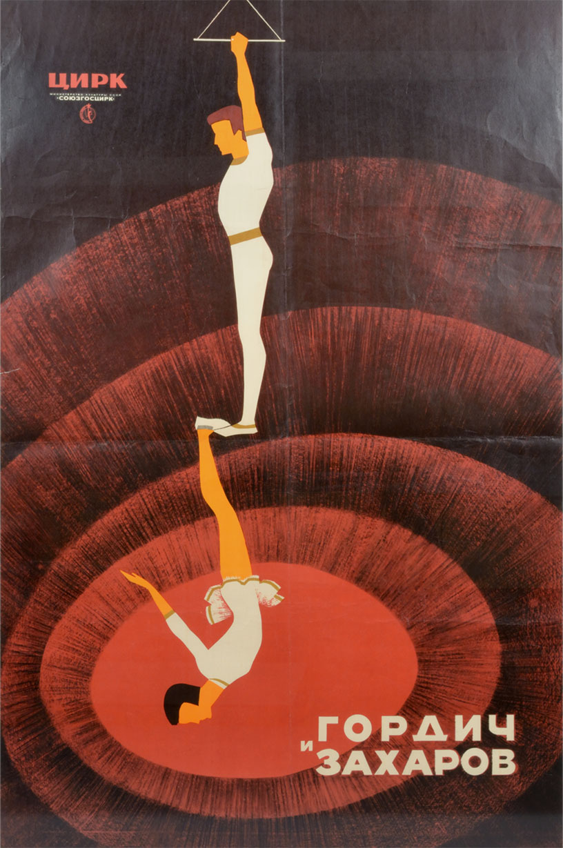 Affiche soviétique montrant deux acrobates, l’un tenant un trapèze et l’autre suspendue par les pieds au premier, sur fond de spirales qui augmentent la sensation de vertige.