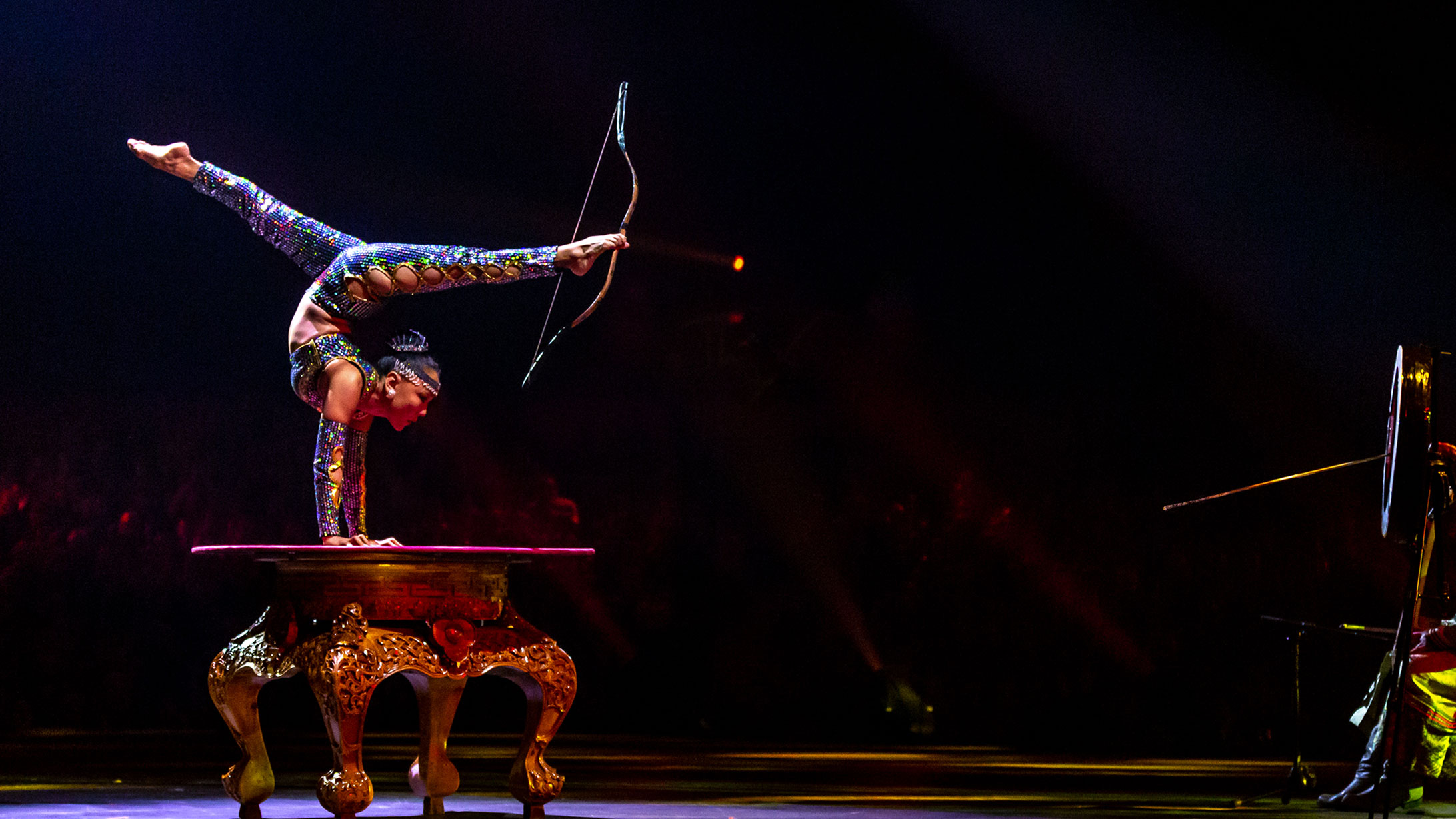Photo d’un spectacle où une femme en costume bleu à paillettes, tient en équilibre sur ses mains sur une grosse table. Ses jambes passent par-dessus sa tête. Dans son pied droit, elle tient un arc et semble avoir tiré une flèche avec son pied gauche.