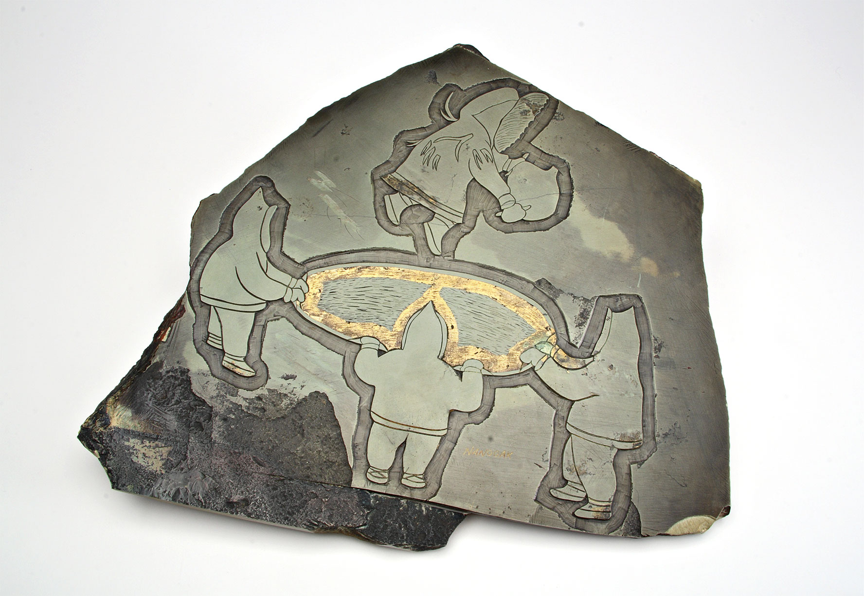 Gravure sur roche montrant quatre Inuits habillés de manteaux. Trois portent une couverture bien tendue alors que le quatrième saute dessus tout en semblant jouer du tambour.
