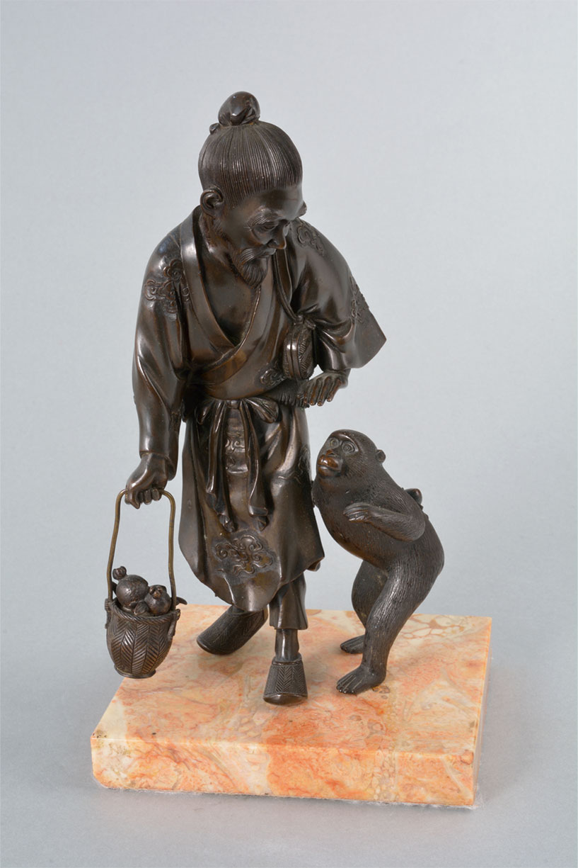 Statue en bronze d’un homme asiatique en kimono portant un panier de fruits. Il regarde un singe qui le tient par la jambe.
