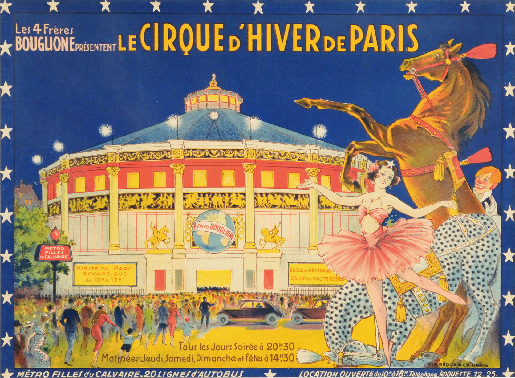 Affiche peinte du Cirque d’Hiver de Paris. En avant-plan, une femme en tutu et deux chevaux semblent accueillir une foule de visiteurs qui se dirigent vers le bâtiment du cirque, tout illuminé.