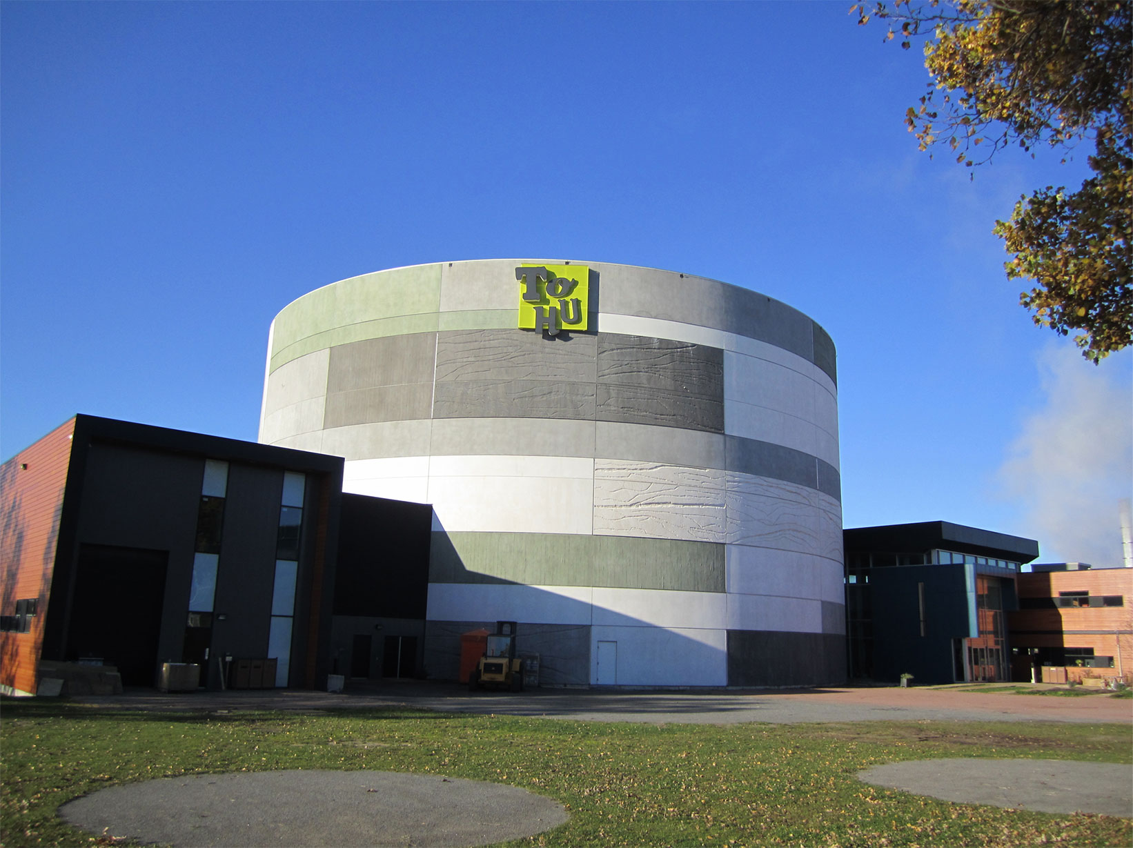 Photo du site de la TOHU. Au centre, le bâtiment principal est cylindrique et coloré de différentes teintes de gris. Sur les côtés, les bâtiments bruns sont plus petits et plus ordinaires.
